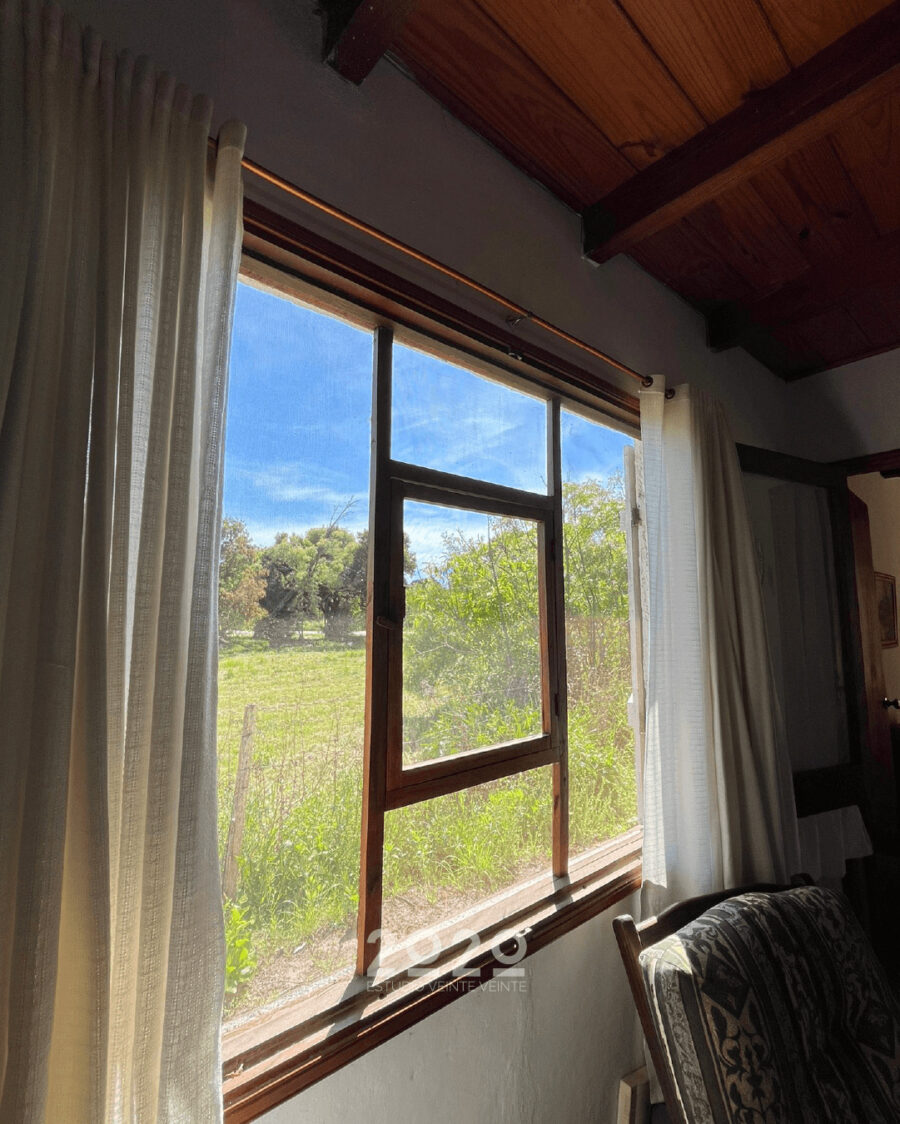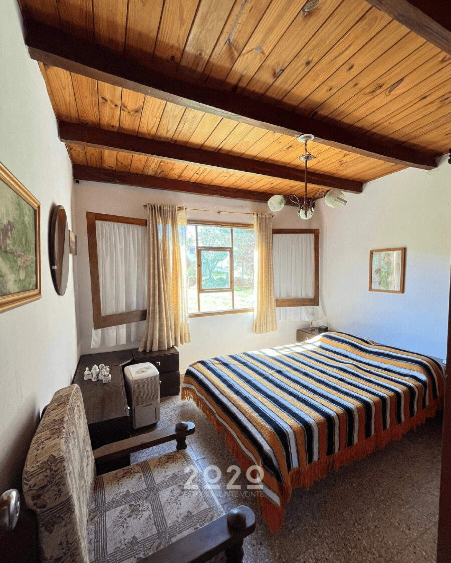 Comodidades, living con estufa a leña, cocina, dos dormitorios, uno en planta baja y otro en planta alta más buhardilla, baño, galpón para herramientas.